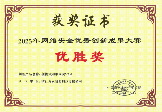 近日,在中央网信办网络安全协调局指导下,中国网络安全产业联盟(CCIA)正式公布了“2025年网络安全优秀创新成果大赛”评选结果。浙江齐安信息科技有限公司自主研发的便携式运维网关V2.0,凭借卓越的创新性和显著的应用价值,成功荣获大赛创新产品“优胜奖”。