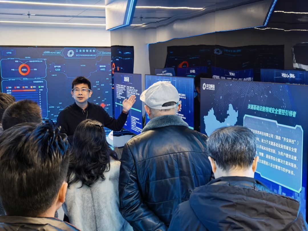 随后,众人来到齐安科技办公与展示区域。公司董事长结合企业发展历程,系统介绍了齐安科技在工业互联网安全行业内的核心产品与解决方案。党员们近距离了解了网络安全技术在国家关键信息基础设施防护和数字经济安全发展中的重要作用,对齐安科技坚持自主研发、深耕行业安全的发展模式给予充分肯定。
